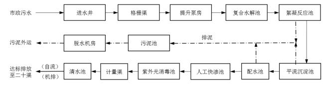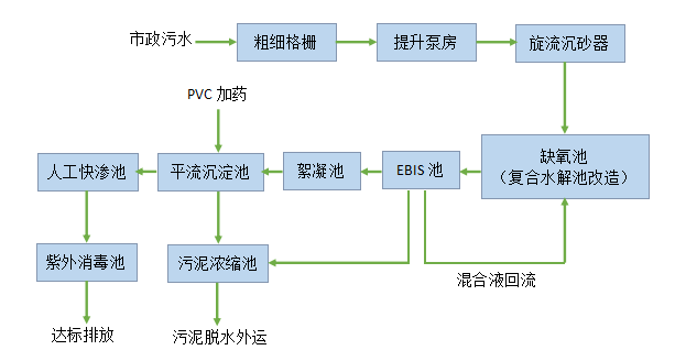 針對以上改造問題,匯恒環保設計團隊在充分考慮該水廠實際運行情況,以及工藝先進可靠、經濟成本合理、充分利用現有設施條件等要素的基礎上,通過加裝機械格柵、增設旋流沉砂器、生化增設EBIS(改良A2O)池、深度處理采用“絮凝池+平流沉淀池+人工快滲池”、加裝紫外消毒設施等解決方法,大大提高系統脫氮除磷性能,并實現系統擴容需求,出水水質穩定達到一級A標準。