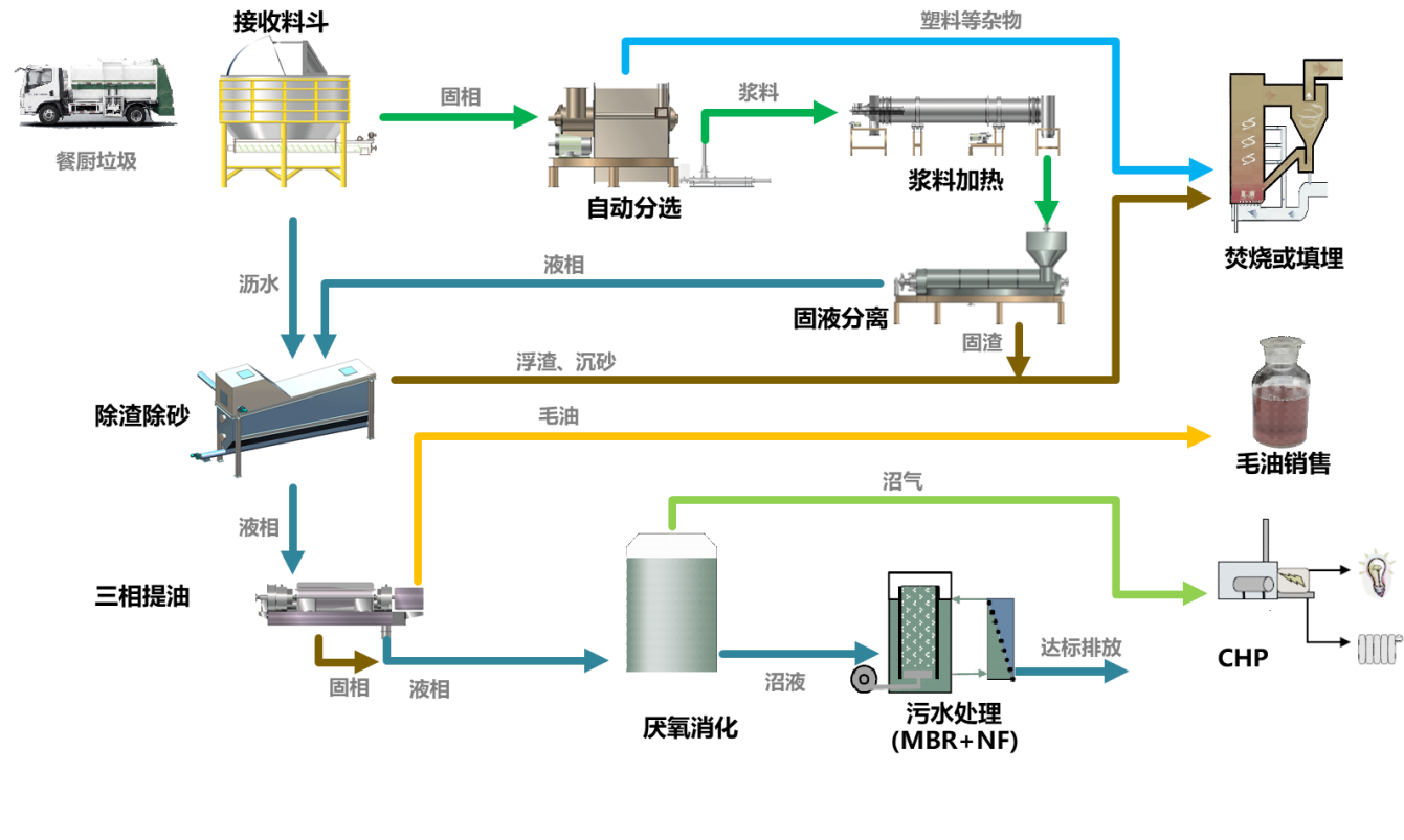 為了更充分的提取油脂以及把有機質轉化成沼氣,餐廚垃圾首先要經過 “自動分選-漿料加熱-固液分離”等一系列工藝處理。