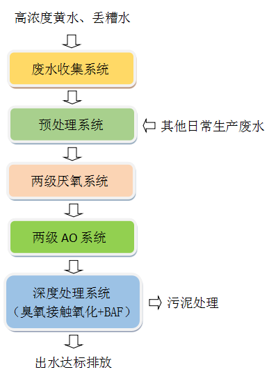 因其他日常生產廢水中污染物濃度較低,因此本方案設計將濃度很高的黃水、丟糟水與其他日常廢水按比例“勾兌”,緩慢釋放,既保證了高濃度黃水和丟糟水不對污水處理系統造成沖擊影響,又能使進入污水處理系統的的廢水不產生濃度過低的現象,提高系統的利用效率。