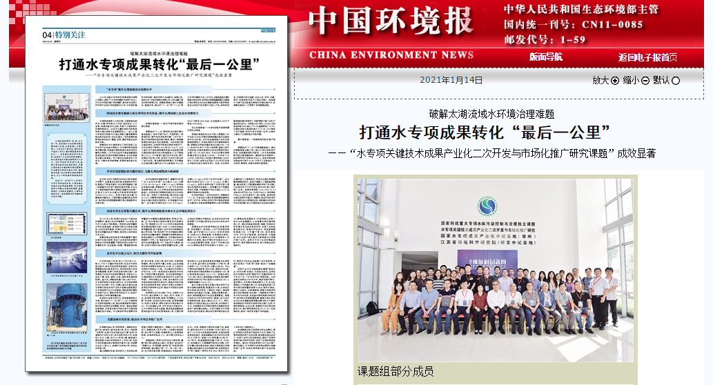 2021年1月14日,《中國環境報》聚焦維爾利環保科技集團股份有限公司,刊登了題為《破解太湖流域水專項治理難題 打通水專項成果轉化“最后一公里”》的文章。